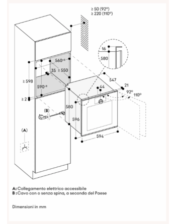 Per l’installazione sotto i piani di cottura: distanza tra il lato inferiore del piano di cottura e il bordo superiore della cavità del forno: min. 15 mm. Tenere conto delle note di progettazione dei piani di cottura (in particolare per quanto riguarda la ventilazione e l’allacciamento al gas/elettrico).